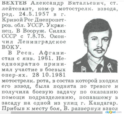 Луна: Исходя из информации от А. Черножукова, что в тот день погиб командир взвода 9 мср А.Вехтев, то это произошло 28.10.1981г. В этот же день погибли бойцы артдивизиона Хрюкин и Заторский.
