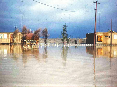 Сергей Иванов: ... это весенний разлив 88. Лавина грязевого потока с огромной скоростью заполнила тогда за несколько минут сухое русло реки Тарнак. Вода перехлестывала через мост. Два БТРа, что стояли под ним, унесло метров на 300-400 по течению. А когда, где-то через час, уровень воды спал, тогда и был сделан этот снимок. Дом с баней не смыло потому, что предварительно перед ними был выстроен земляной вал, принявший на себя первый удар потока. Такого разлива живущие рядом с Тарнаком белуджи не помнили. Редкий случай. Валерий Мухин: Весна 1988 года . Разлился арык ТАРНАК . Слева домик и курилка разведвзвода , справа - 8 -ой роты .