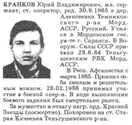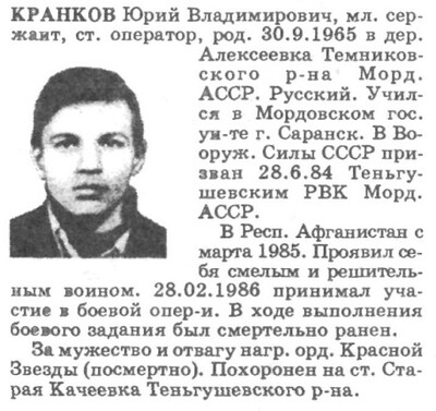 И.Окладников: С гор стреляли, а я с товарищами мины итальяшки в кузов грузил... В.Келеш: В конце февраля был рейд точно не помню, по-моему где-то к границе Пакистана, там база духов была. Спецназ на вертушках, а мы колонной. Там вертушку сбили. Погибли по моему спецназовец и с вертушки ещё. Как раз мы подоспели и в ущелье много пещер было. Ну и Кранков побежал за духами при входе его и убили. Кошкой вытаскивали из пещеры. О.Борисов: Кранков погиб где ЗиЛ трофейный взяли. Я хорошо помню как погиб Ю.Кранков. В.Келеш: Да, ты прав, Олег, Кранков погиб там и ротным был Рыков! С.Епихин: С 28 февраля - 2 марта 1986г. - горный массив "горы Адигар", совместная операция бригады со СпНазом, влево от трассы Калат-Газни. В. Келеш: Наша рота 27 числа была на месте, а 28 вошли в ущелье, где Кранкова убили, а к вечеру уже вся бригада прибыла! Да, Сергей, до 2 марта был этот рейд. И.Окладников: Когда Кранкова сапёрной кошкой вытащили гранатки туда покидали, потом в гору полезли... наверху взяли КПВ пулемётчика замочили...перли вниз КПВ по очереди... тяжелая железяка... гора вся в проволоке от птурсов... как зацепишься за проволоку-думаешь растяжка.
