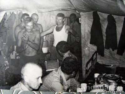 Эдуард Табуев: Сидел 6 суток в октябре 87 на Кандагарской Губе. Фото как раз плаца. по которому также ползал 2 суток. Потом с парнем с моего взвода обивали бомботарой и досками от градовских ящиков домик где жили водители. Спали в доме, вторая половина была для офицеров. с торца комната дежурного по Губе. Туалет один был загаженный, другой чистый, но там не было стенок только крыша и под ней очки. Жратву привозили с бригадной столовой, сам ездил 2 раза получать. Каждый день плац мыли утром с мылом и арсовскими щетками. Кто не был задействован на работах, тот бегал и ползал по плацу. В 5 подъем, в 23 отбой хватаешь вертолет=три доски в рамке металлической и в камеру. Кладешь на трубы края и бай бай. Днем в камере находиться нельзя. Одна часть Губы была разделена забором с госпиталем. От туда иногда можно было достать курево и спички. А так если находили это, то добавляли 3 суток. Курить по очереди ходили в загаженный туалет.