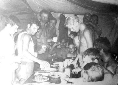 Михаил Строганов: Это к-н Батяев, а разливает наш комбат Фёдор Иванович Рошиору. Это застолье организовали, когда из танкового батальона после окончания службы в ДРА уезжала группа офицеров и прапорщиков по замене. На этой фотографии слева: за комбатом Ф. Рошиору сидит Вячеслав Батяев, Купцов Сергей, к-н Потёмкин, прямо в центре "Ибрагим" и к-н Данилов Н. Н. Справа сидят: первым виден затылок Володи Стрючкова, за ним Илья, напротив комбата стоит Ренат Казаков. Остальных не помню. Некоторых уже нет среди живых ...