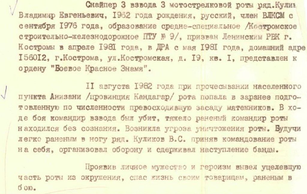 Ниже статья из газеты «Костромские ведомости», где о том бое рассказывает его непосредственный участник Владимир Куликов. В донесении сказано, что снайпер Владимир Евгеньевич Куликов представлен к ордену «Красного Знамени». Однако в статье, да и на видео 11.8.2012г. у Владимира Куликова орден «Красная Звезда». Видимо в верхах срезали награду, посчитали достаточно «Звезды» солдату.
