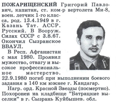 Видимо воспоминания были записаны журналистом со слов ветерана-кандагарца. Этим объясняются некоторые небольшие ляпы. Но дело не в этом. Главное, что это история начального периода и события, а описанные здесь события имели место. Что касается гибели командира вертолёта Ми-8Т (3-й вэ 280-го ОВП) капитана Григория Пожарищенского, то это произошло 22.9.1980г. Тогда же погиб командир отделения бригадной разведроты Георгий Нечаев.