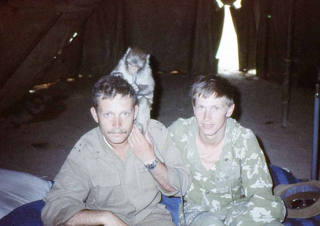 Вот кстати и фотография, сделанная в 1984г., где Лизка сидит на плече командира 6 мср капитана Михаила Поздняка. Рядом офицеры и прапорщики 6 мср.