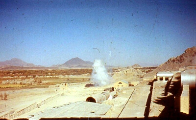 Валерий Мухин (разведвзвод 3 МСБ 86-88): ООНовский городок. Расположение арт батареи. На дороге стоит танк стволом в сторону Кандагара, на горизонте видно кишлак Насиран.