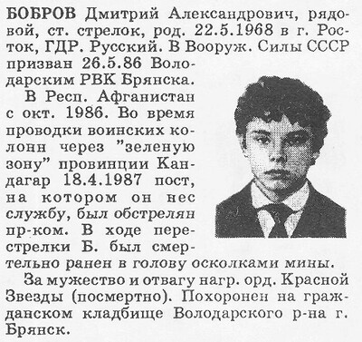 В принципе это нас особенно не удивило, такие вещи иногда случались. Посмотрел на своих соседей справа-слева, все занимаются своими делами, все нормально, все живы-здоровы. А левее, на позициях, занятых группой ротного, вдруг слышится шум, суета, чьи-то крики. - Что случилось? - Боброва ранило осколком снаряда! - Так вроде же далековато упали! - Ну вот как-то угораздило его! Как оказалось, во время этой самой огневой поддержки Бобров стоял, операясь локтями на дувал и смотрел в зеленку, артиллерийский снаряд разорвался прямо перед ним метрах в ста, и его осколок попал ему прямо в лоб. Такое ранение само по себе уже было критическое, но Нефляшев, замполит роты, еще и промедол ему вколол, что недопустимо при ранении в голову! "Бобра" быстро уложили на носилки, загрузили на БМП и немедленно отправили в госпиталь, но успели довезти только до поста "ГСМ", где он и умер. Справедливости ради, он бы умер, как мне кажется, и без помощи замполита, ведь осколок пробил даже лобную кость. Каждый год, что ни апрель, то потери!
