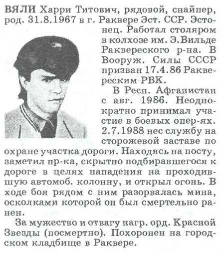 Последней жертвой, принесенной Эстонской ССР в этой затянувшейся афганской войне, стал рядовой Харри Вяли, скончавшийся 2 июля 1988 года и похороненный на кладбище Тырма в Раквере. До конца войны и полного вывода советских войск из Афганистана оставалось 288 дней…
