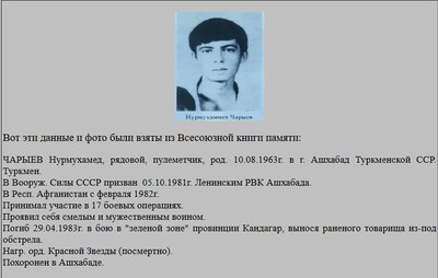 | В списке потерь Э.Береснева 2.4.1985г. значится погибший член экипажа танка-заряжающий ряд. Шашаев Фасхутдин Мирович (таджик). Погиб в бою в районе "зеленой зоны" провинции Кандагар. Фотография во ВКП отсутствует. Прошу наших танкистов вспомнить события того времени и подтвердить принадлежность Фасхутдина к ТБ бригады.