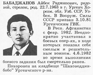 | По поступившей информации установлены ещё двое погибших, которые проходили службу в нашей бригаде. Подразделения пока неизвестны. Это рядовой Бердимуратов У.С. умерший от болезни 09.02.1982г. и погибший 04.06.1982г. рядовой Бабаджанов А.Р. Просьба помочь в установлении подразделений.