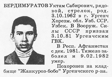 Благодаря информации Николая Кывыржика установлен ещё один погибший из нашей бригады. Это сержант Джурабай Тусметов из 3 мср, погиб 12.8.1982г.