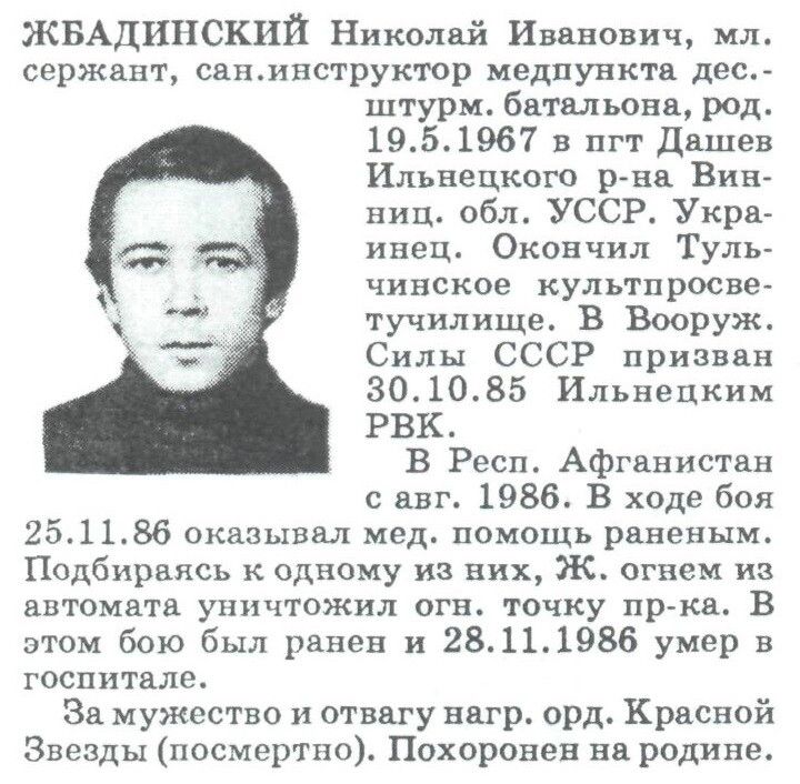 | По информации от Анатолия Голикова умерший от ран в госпитале 28.11.86г. санинструктор мл.с-нт Жбадинский Николай из БМП ДШБ. В списке безвозвратных потерь Э.Береснева в/ч где служил Николай отсутствует.