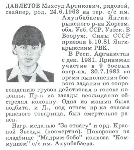 | Получена информация о принадлежности к нашей бригаде ещё одного погибшего. Это рядовой Давлетов Махсуд Артикович, погибший 30.7.1983г. в результате обстрела колонны. Подразделение также неизвестно.