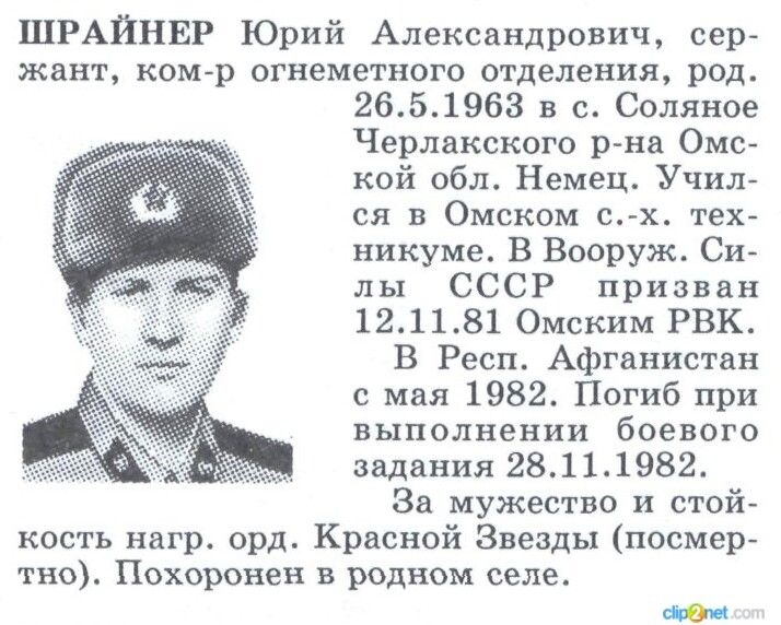 Сержант Шрайнер Ю.А. - командир огнемётного отделения, погиб 28.11.82г.