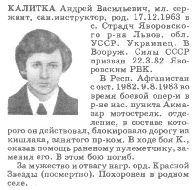 А вот что пишет в 2008г. Кирилл Хвесько: Я служил в Кандагаре в 1982-83г, рядовой из 2 батальона. Были в рейде в августе 1983г, я получил ранение-сильно посекло осколками. Меня спас, вытащил из-под обстрела санитарный инструктор Андрей Калитка(нашел его в вашем списке, я даже не знал, что он погиб буквально через 2 дня, как меня вытащил). Какой был парень! Сейчас пишу и не могу унять слезы- он погиб, а я живу уже 25 лет. Я ведь все эти годы его благодарил, разговаривал мысленно с ним, мечтал его найти. И вот нашел... Теперь буду ставить за него свечи за упокой его души. Пусть земля ему будет пухом! ВЕЧНАЯ ПАМЯТЬ! С уважением к вам. Кирилл.