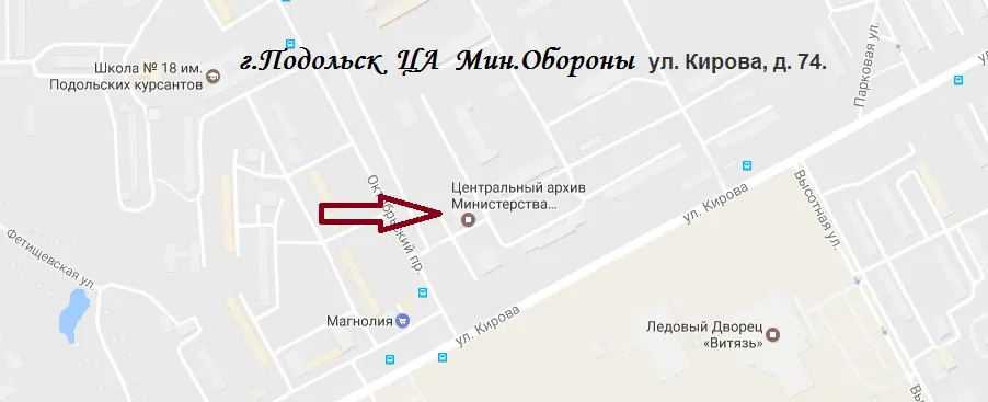 Справочно-информационная служба 8 (4967) 69-90-05 Начальник Пермяков Игорь Альбертович 8 (4967) 63-77-07 Заместитель начальника Емельянова Наталья Михайловна 8 (4967) 52-76-65 Заместитель начальника по филиалам Цымлянский Виктор Павлович 8 (4967) 69-90-33 Общий отдел (руководства справочной работой и делопроизводства) 8 (4967) 69-90-05 Приемная ЦА МО (прием и оформление запросов граждан, прибывших лично) 8 (4967) 52-76-38 Заведующая читальным залом Волкова Ольга Викторовна 8 (4967) 52-76-68 Адрес ЦА МО: 142100, Московская обл., Подольск, ул. Кирова, д. 74. от станции Московского метрополитена «Южная» - автобус № 406; от станции Московского метрополитена «Бульвар Дмитрия Донского» - автобус № 520; от железнодорожной станции Подольск – троллейбус № 1, 2 до остановки «Архив Минобороны». График читального зала и приемной посетителей: понедельник–четверг — с 9.00 до 12.00 и 13.00 до 17.00; пятница — с 9.00 до 12.00 и с 13.00 до 15.45; В предпраздничные дни — сокращенный рабочий день до 14.00 Последний рабочий день каждого месяца — санитарный.