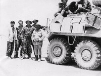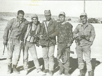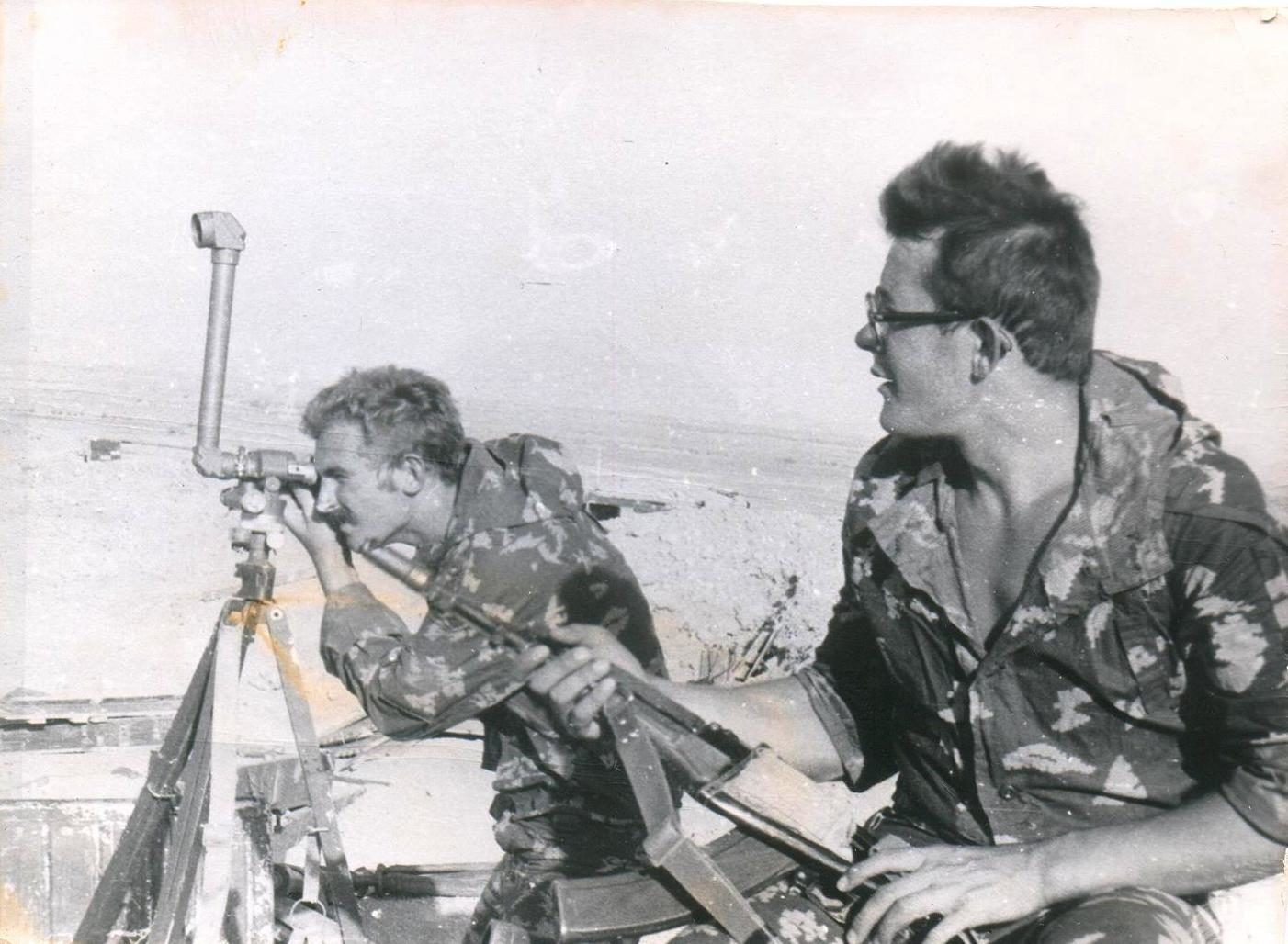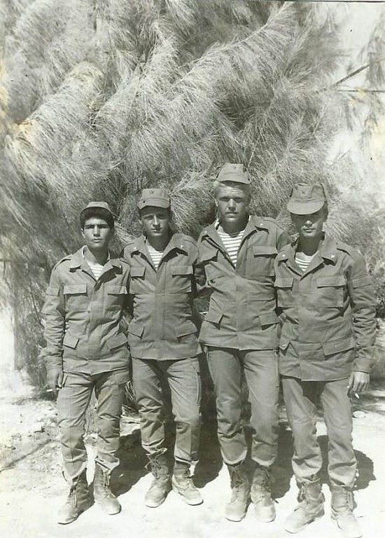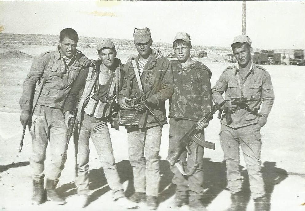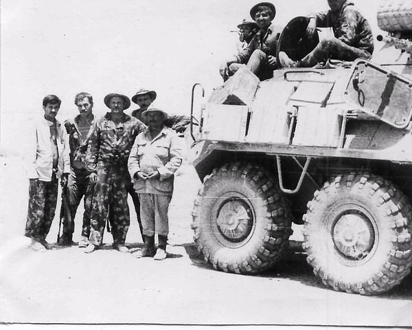 Первый справа возле БТР - м-р Либенко "Максимыч" - замполит 2мсб. В пустыне в 1мсб ,июнь 1984г. .Архив И.Позднякова....