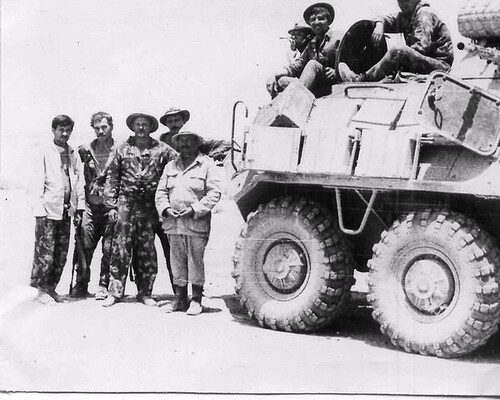 Первый справа возле БТР - м-р Либенко "Максимыч" - замполит 2мсб. В пустыне в 1мсб ,июнь 1984г. .Архив И.Позднякова.