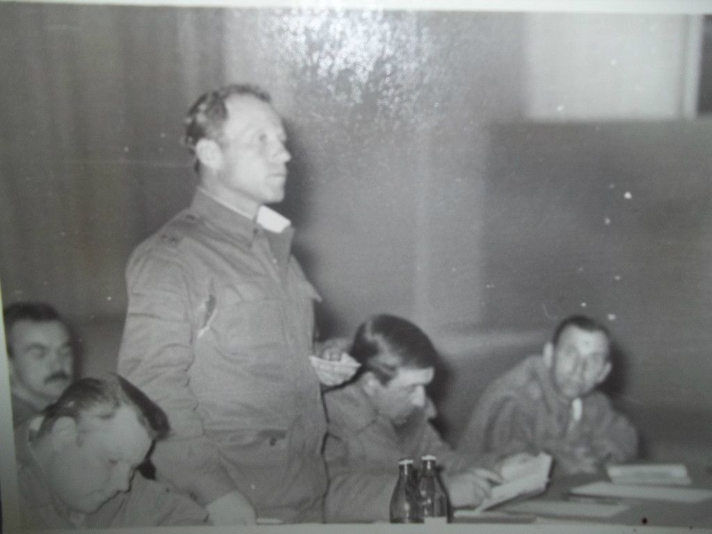 Н.Пархоменко: Собрание 70 омсбр - Пархоменко, за мной Лазарев, стоит Павленко, Никулин, генерал Пищев
