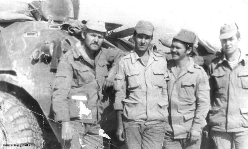 Слева направо: ст.лейтенант Черных, начмед 4 батальона ст.лейтенант Мерзляков Володя, ст.лейтенант Жалнин Андрей и офицер с "Элеватора" (командир батареи). На "Элеваторе" из 4 батальон стояли 3 взвода 11-й роты (командир роты Тишковец Владимир Иванович, замполит Якимкин Владимир). Один взвод 11 роты стоял на ГСМе. Несколько человек сидели на "Памире" - вели корректировки во время сопровождений. Командир одного из взводов 11-й роты Асеев Андрей успел повоевать и на Элеваторе, и на ГСМ, и на Памире (не фото нет). У него во взводе был хороший снайпер Цуканов Николай [Дмитриевич]. Должен жить в Тверской области.