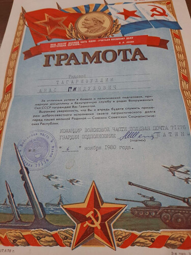 Грамота, которой награждён рядовой Анас Тагарифуллин (ремрота), подписанная легендарным комбригом, тогда ещё подполковником М.Шатиным. 6 ноября 1980г.